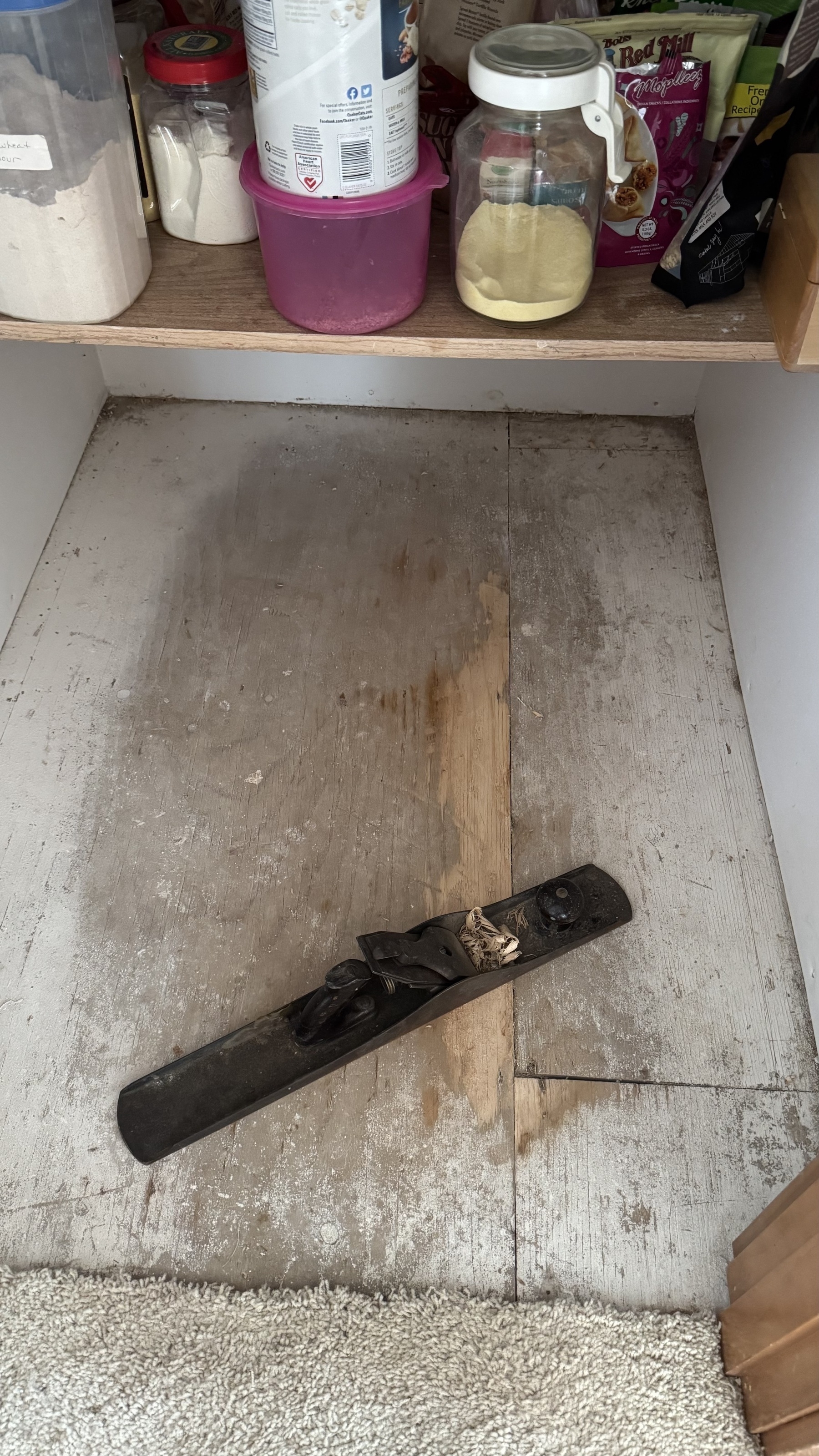 The plywood flooring was a little uneven and it was an opportunity to use my grandpa’s plane to smooth things out.