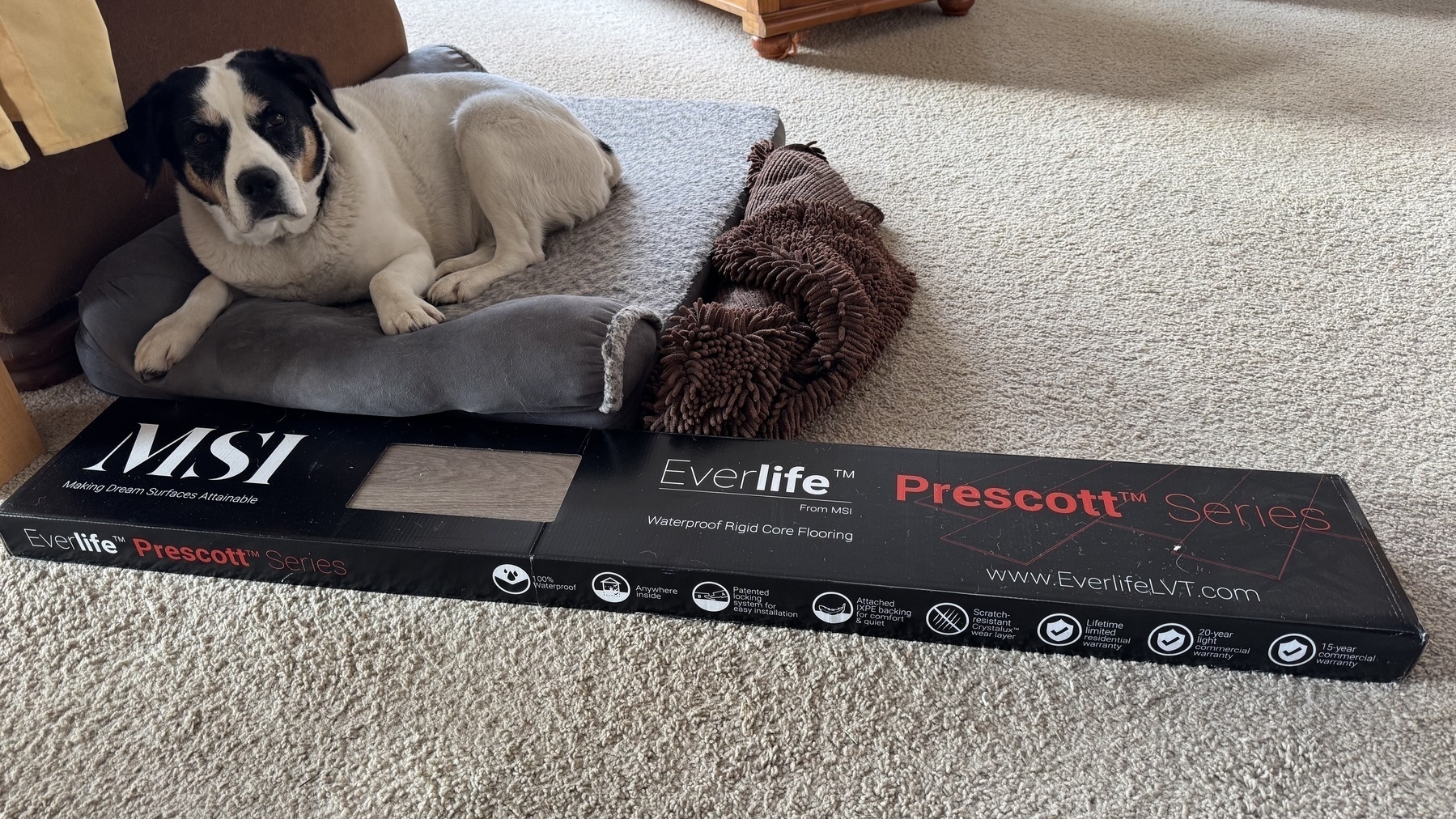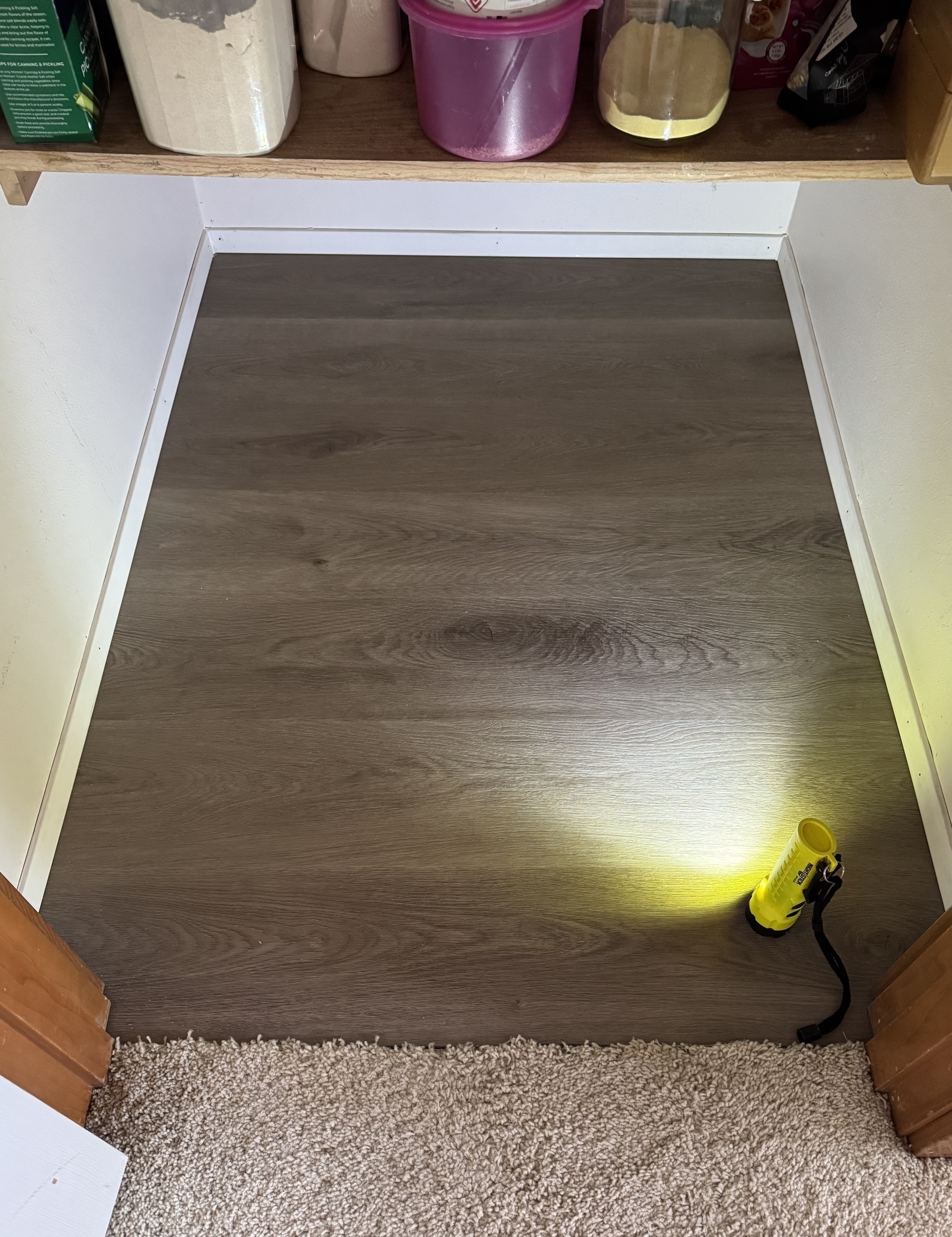 Today’s project: prepping to replace the carpet in our pantry with laminated vinyl tile.