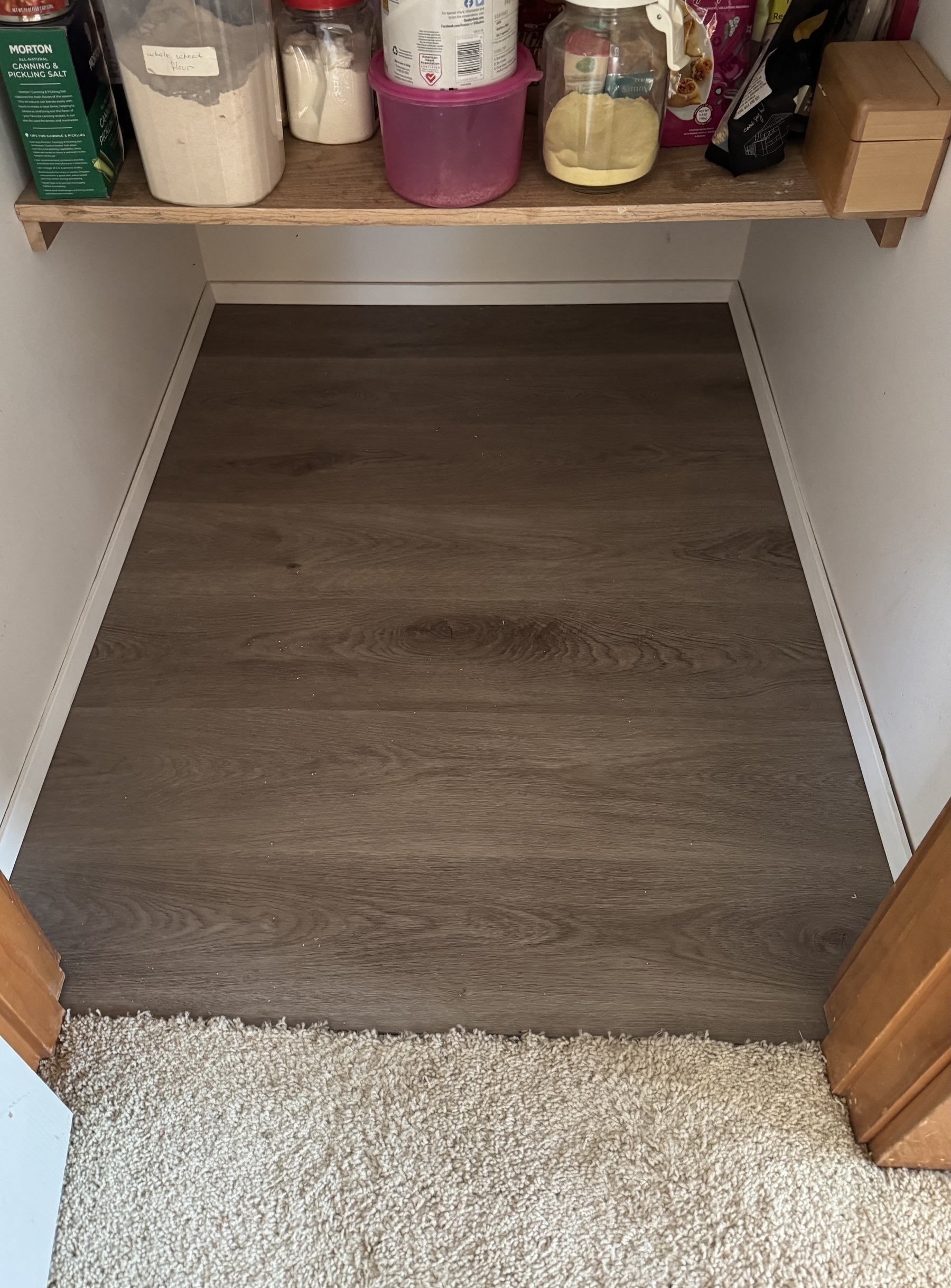 Good progress today on the pantry floor, now I just need to attach the new baseboards to the wall and I can call it done.